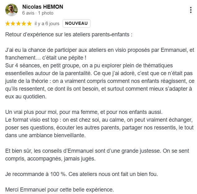 À la naissance de mes enfants, j’ai moi-même traversé des périodes de doute, de fatigue, de surcharge… Comme beaucoup de parents, j’ai cherché des repères, du soutien, des clés. Les ateliers de parentalité que j’ai suivis à ce moment-là ont été un vrai tournant : ils m’ont aidée à retrouver confiance, à comprendre les besoins de mes enfants — mais aussi les miens.